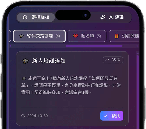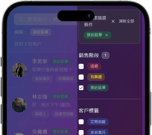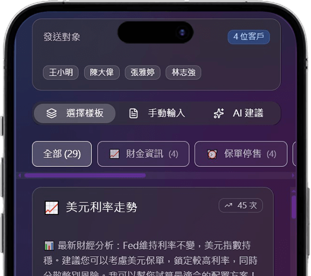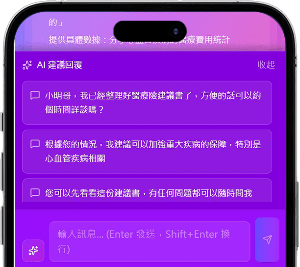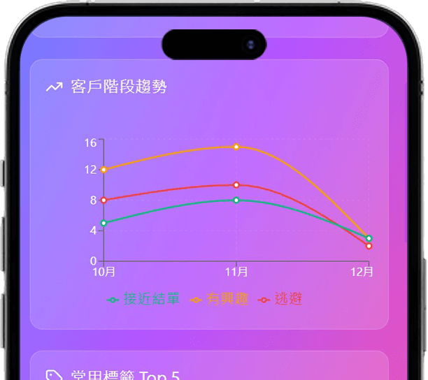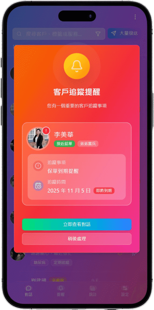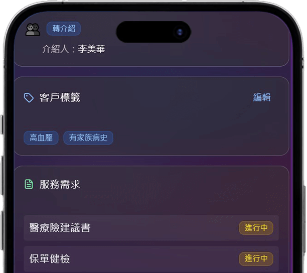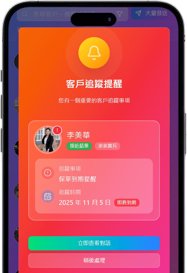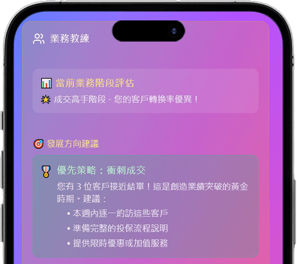專為保險業務打造的AI隨身教練從小白躍升超業 讓超業變成傳說 「Aifalo跟進王」不只是管理工具,而是您在數位時代最可靠的業務成長引擎。 訓練多位銷售大師模型 0 位+ 提升成交機率 0 %+ 訪談者期待率 0 % 專為保險業務打造的AI隨身教練從小白躍升超業 讓超業變成傳說 「Aifalo跟進王」不只是管理工具,而是您在數位時代最可靠的業務成長引擎。 訓練多位銷售大師模型 0 位+ 提升成交機率 0 %+ 訪談者期待率 0 % 業務路上有我們陪你「財富就藏在持續的跟進裡。」 哈維.麥凱(Harvey Mackay) 全球最受歡迎TOP5演說家、被美國《財星》雜誌譽為「萬能先生」 「跟進」-決定你是普通的銷售員,還是專業的問題解決者。 業務員第一痛「新客無法進一步,舊客守不住」 追蹤名單只能靠記憶和紙本,總在錯過後才懊惱?生日、保單到期、續保…,重要的日子總在混亂中被遺忘?跟進節奏全憑感覺,不是太頻繁惹人煩,就是太久被遺忘?跟進永遠不知道要說什麼? 業務員第二痛「好像..,客戶有交待過...」 所有對話都在LINE,重要資訊或客戶需要的服務,淹沒在訊息海,根本找不到?客户的家庭狀況、興趣喜好、健康細節,都散落落在腦中或便條紙上?或者要花很多時間紀錄到電腦系統。面對不同客戶,客戶的狀態無法掌握,難以判斷對方真實意向? 業務員第三痛「做了很多事,但...我做對了嗎?」 發送節慶祝福或停賣通知,只能逐一複製貼上,耗費大量時間?名單來源混雜(BNI、獅子會、扶輪社),無法有效分群,進行精準經營?缺乏數據回饋,不知道自己的努力,到底哪裡有效、哪裡該加強?業務生涯混亂,需要隨身教練建議? 簡單邁向成功的步驟重新回到您的超業旅程 「很多成交不是輸在價格,而是輸在沒人跟進。」-吉格・金克拉(世界著名銷售大師) 步驟一找到能提醒跟進時間的工具,並能建議溝通話題 讓你的跟進,能掌握時間、節奏,搭配適合的跟進溝通術,讓客戶從陌生變熟客,甚至願意替您引薦,做到自然而然,水到渠成。 步驟二能從對話中,自動記錄重點與客戶資料 不要再浪費大量時間時間輸入與紀錄,就能自動記錄客戶的喜好、需要的服務,對話的重點。利用AI幫客戶建立標籤與判斷現在客戶狀態。 步驟三像隨身業務教練的強大工具 不管是對客戶的溝通內容或是對自己的增員夥伴的訓練都可以做成對話樣板,分群管理,大量發送。整合多位銷售大師的業務精華,AI智慧在適當的時候給您客戶溝通的建議,讓你減少學習時間,直接使用銷售大師的溝通智慧。 隆重介紹aifalo 跟進王您的AI智慧隨身業務教練 這不只是一個App,而是一套基於通訊軟體為您整合「客戶關係管理」、「AI溝通策略」與「數據化決策」的致勝系統。 自動AI重點摘要 客戶基本資料、客戶喜好。 智慧化標籤、需要服務紀錄。 客戶歷程、客戶關係管理。 減少你輸入筆記的時間,釋放雙手。 AI隨身業務教練 自動化判斷客戶當下狀況。 上百個銷售談判大師的模型訓練。 心理學+NLP理論加持。 模仿你的談話語氣,提供你溝通的建議。 智慧提醒 不再錯過任何跟進時機。 自訂時間、循環時間,永不漏接。 服務到位,客戶滿意度加倍。 分群樣板大量發送訊息。 數據洞察 客戶歷程分析。 最常服務類型。 A、B、C級客戶統計。 業務生涯策略規劃與建議。 用科學看見成長路徑。 Why Choose Us? 簡單邁向成功的步驟重新回到您的超業旅程 「很多成交不是輸在價格,而是輸在沒人跟進。」-吉格・金克拉(世界著名銷售大師) 簡單邁向成功的步驟重新回到您的超業旅程 「很多成交不是輸在價格,而是輸在沒人跟進。」-吉格・金克拉(世界著名銷售大師) 步驟一找到能提醒跟進時間的工具,並能建議溝通話題 讓你的跟進,能掌握時間、節奏,搭配適合的跟進溝通術,讓客戶從陌生變熟客,甚至願意替您引薦,做到自然而然,水到渠成。 步驟二能從對話中,自動記錄重點與客戶資料 不要再浪費大量時間時間輸入與紀錄,就能自動記錄客戶的喜好、需要的服務,對話的重點。利用AI幫客戶建立標籤與判斷現在客戶狀態。 步驟三像隨身業務教練的強大工具 不管是對客戶的溝通內容或是對自己的增員夥伴的訓練都可以做成對話樣板,分群管理,大量發送。整合多位銷售大師的業務精華,AI智慧在適當的時候給您客戶溝通的建議,讓你減少學習時間,直接使用銷售大師的溝通智慧。 隆重介紹aifalo 跟進王您的AI智慧隨身業務教練 這不只是一個App,而是一套基於通訊軟體為您整合「客戶關係管理」、「AI溝通策略」與「數據化決策」的致勝系統。 自動AI重點摘要 客戶基本資料、客戶喜好。 智慧化標籤、需要服務紀錄。 客戶歷程、客戶關係管理。 減少你輸入筆記的時間,釋放雙手。 AI隨身業務教練 自動化判斷客戶當下狀況。 上百個銷售談判大師的模型訓練。 心理學+NLP理論加持。 模仿你的談話語氣,提供你溝通的建議。 智慧提醒 不再錯過任何跟進時機。 自訂時間、循環時間,永不漏接。 服務到位,客戶滿意度加倍。 分群樣板大量發送訊息。 數據洞察 客戶歷程分析。 最常服務類型。 A、B、C級客戶統計。 業務生涯策略規劃與建議。 用科學看見成長路徑。 Why Choose Us? 功能特色省腦力,省時間,導引方向 🎯跟進不再漏失 🎯對話更有策略 🎯精力聚焦高效 🎯心態永遠正向 忘記跟進、節奏不穩提醒系統+自訂週期 再也不用怕忘記追蹤客戶。新